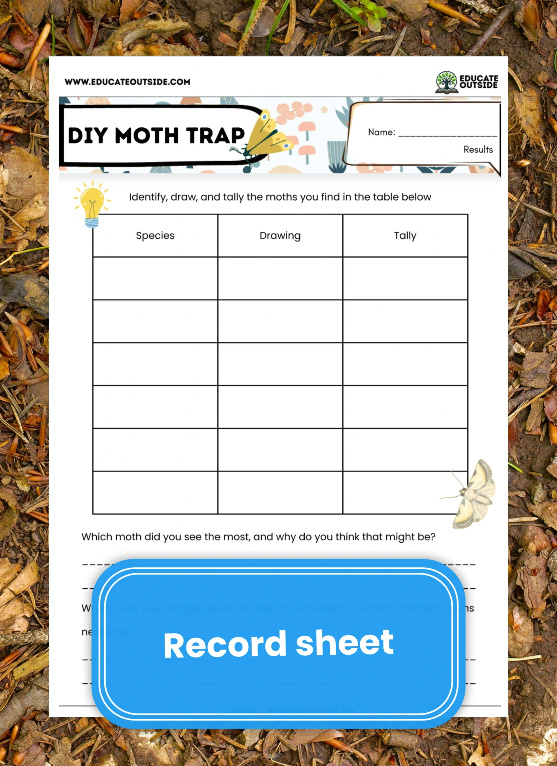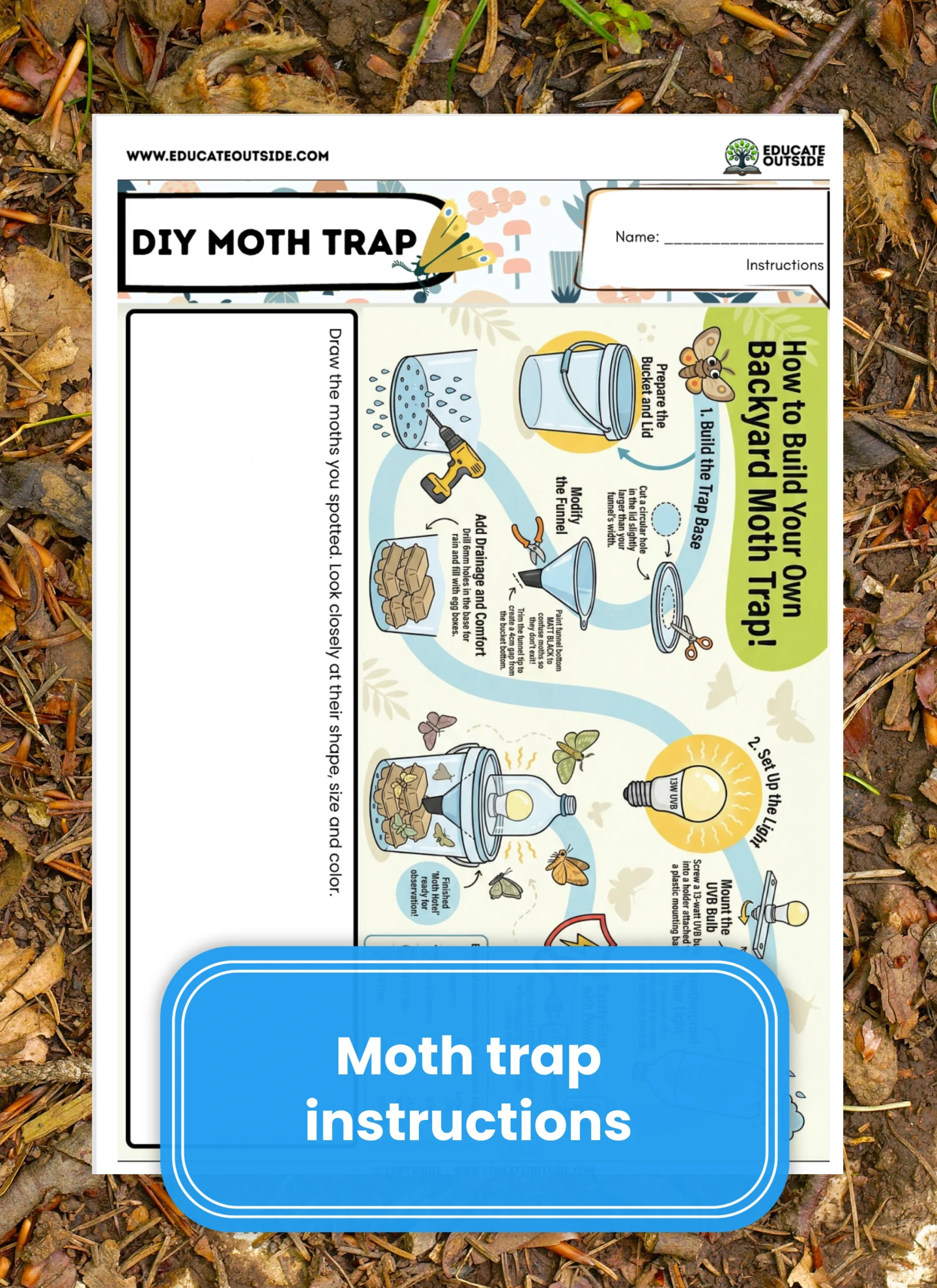 Pupils follow simple visual instructions to construct a moth trap from a bucket, funnel, and light source, then leave it overnight to discover what flies in. The next morning, they carefully observe, identify, draw, and tally the moths they find — supporting key science skills in observation, data handling, and respect for living things.