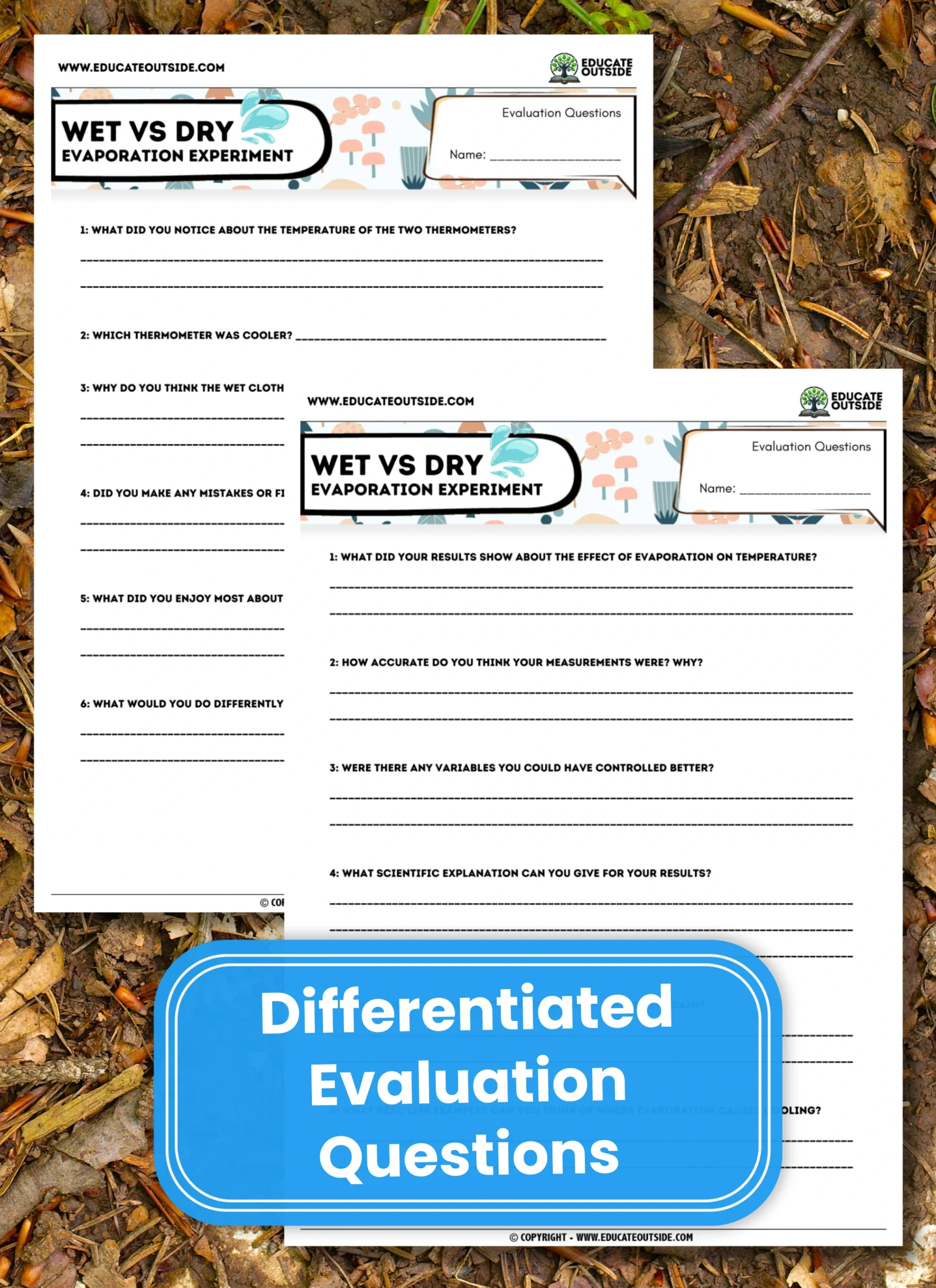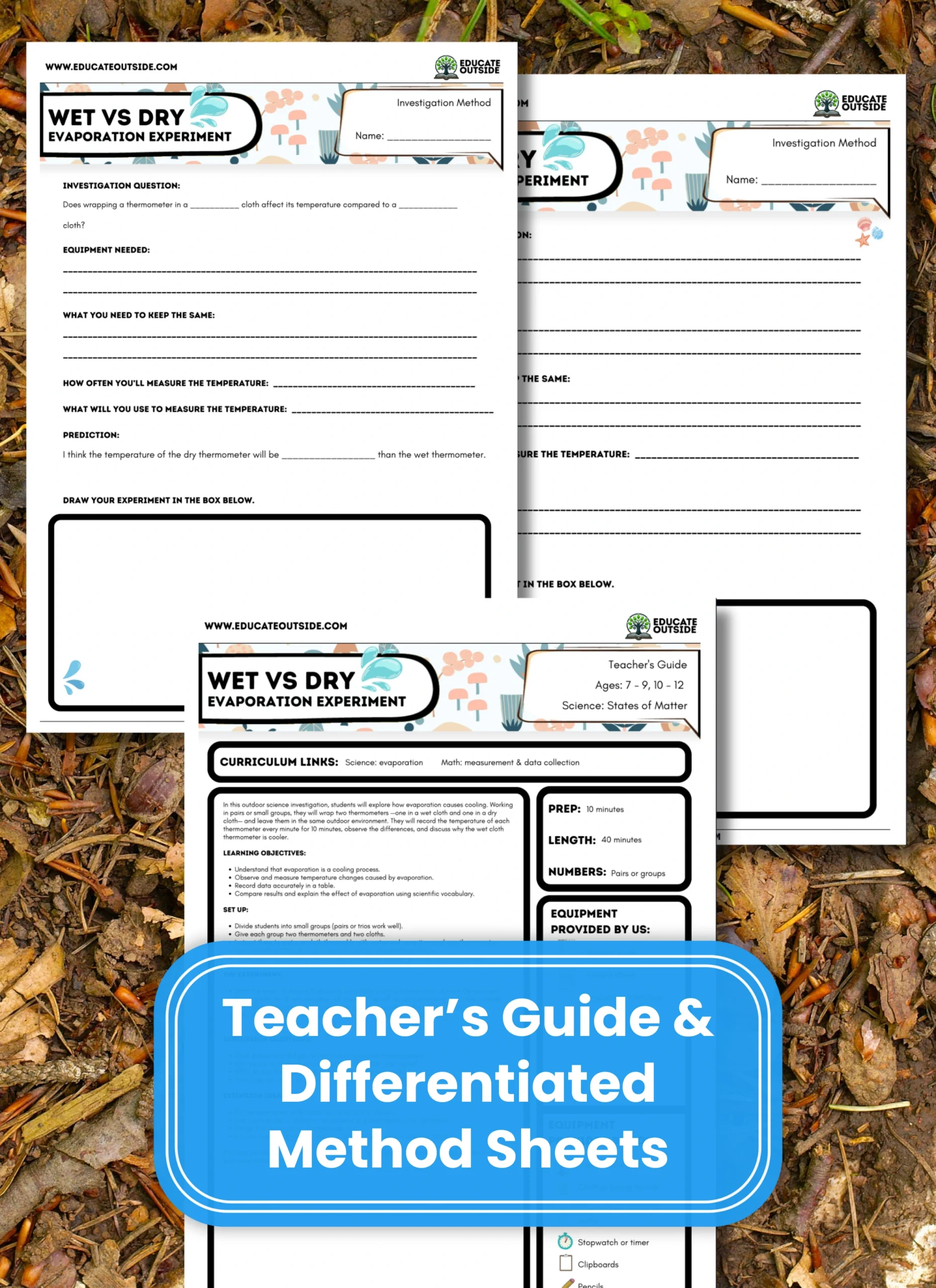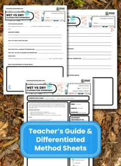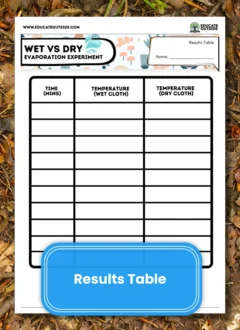 This KS2 / Elementary outdoor science investigation teaches students how evaporation causes cooling. Using two thermometers—one wrapped in a wet cloth and one in a dry cloth—students measure temperature changes outdoors every minute for 10 minutes and compare the results.