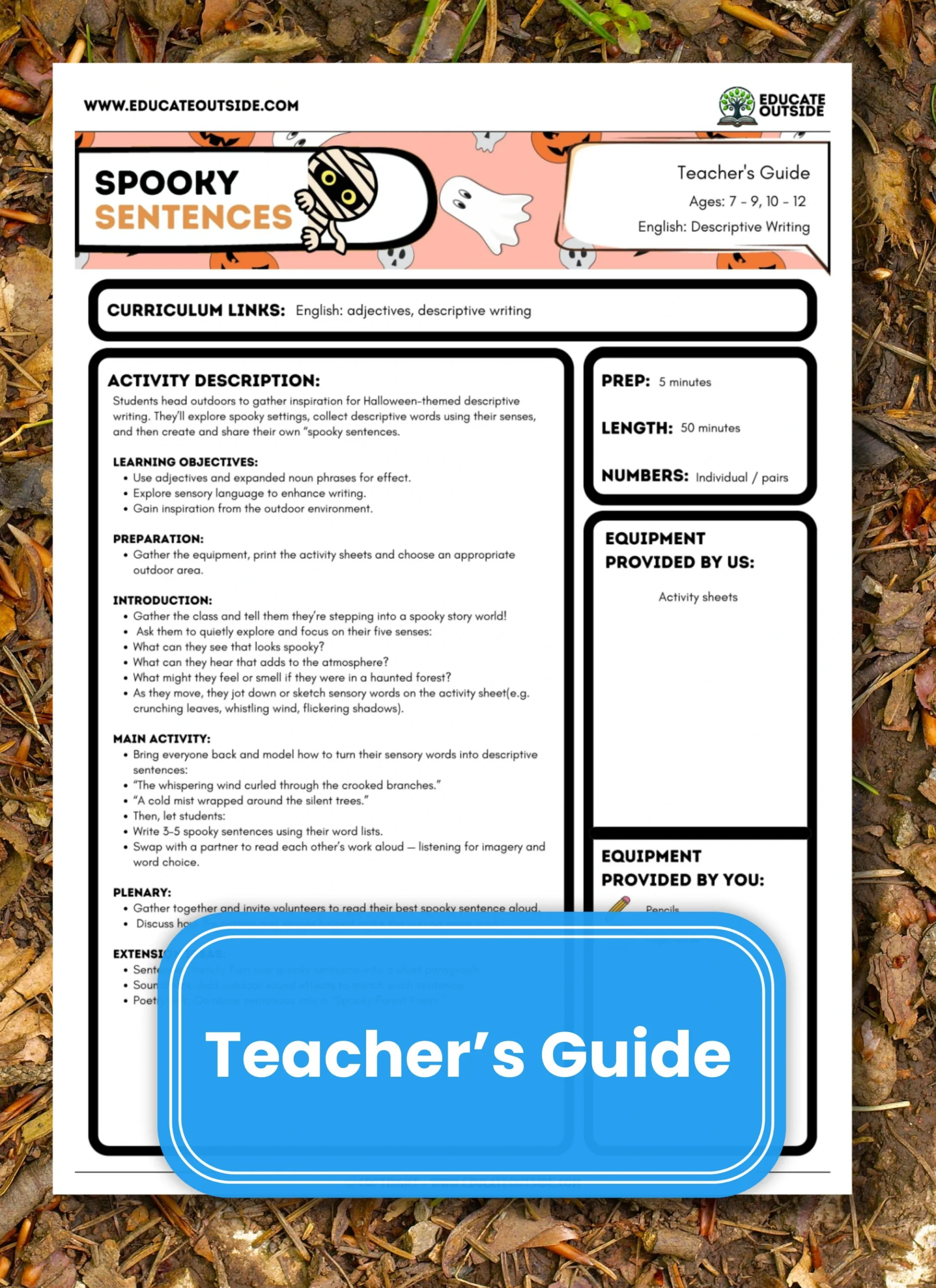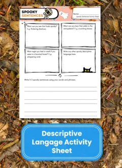 In this Halloween-inspired literacy lesson, children explore the outdoors to collect sensory words and phrases, then use them to build descriptive spooky sentences. Perfect for developing vocabulary, imagination, and confidence in writing. Includes a poetry extension and ready-to-print worksheet.