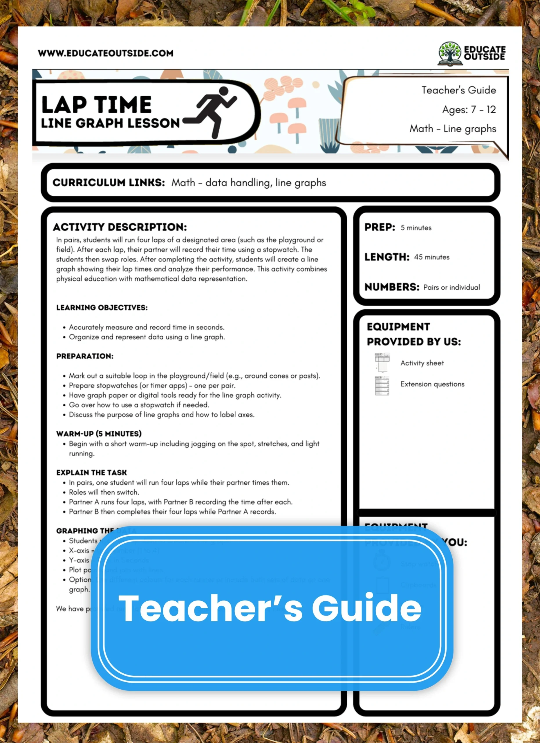 In this line graph math lesson students will run four laps of a designated area (such as the playground or field). After each lap, their partner will record their time using a stopwatch. The students then swap roles. After completing the activity, students will create a line graph showing their lap times and analyze their performance. This activity combines physical education with mathematical data representation.