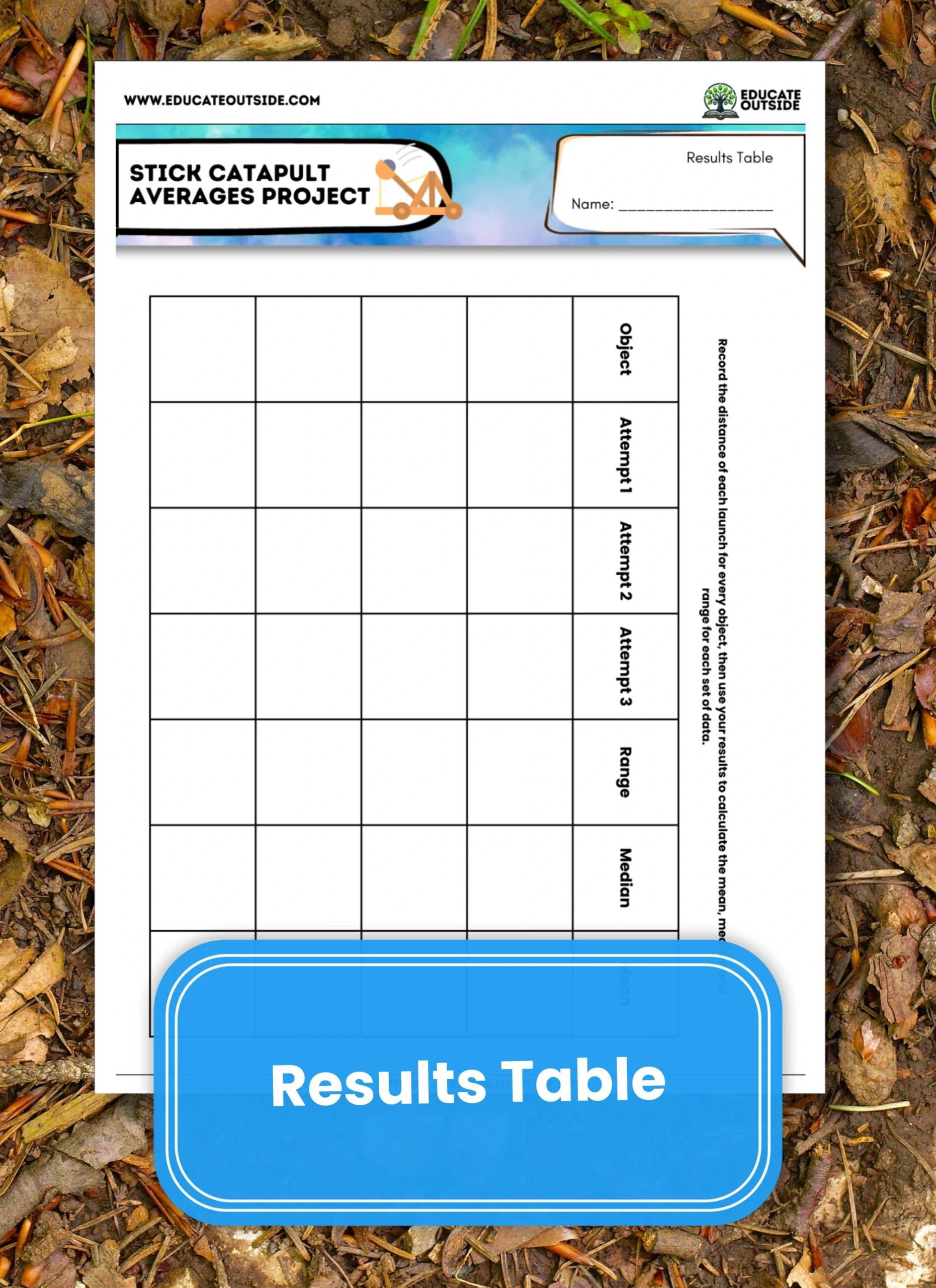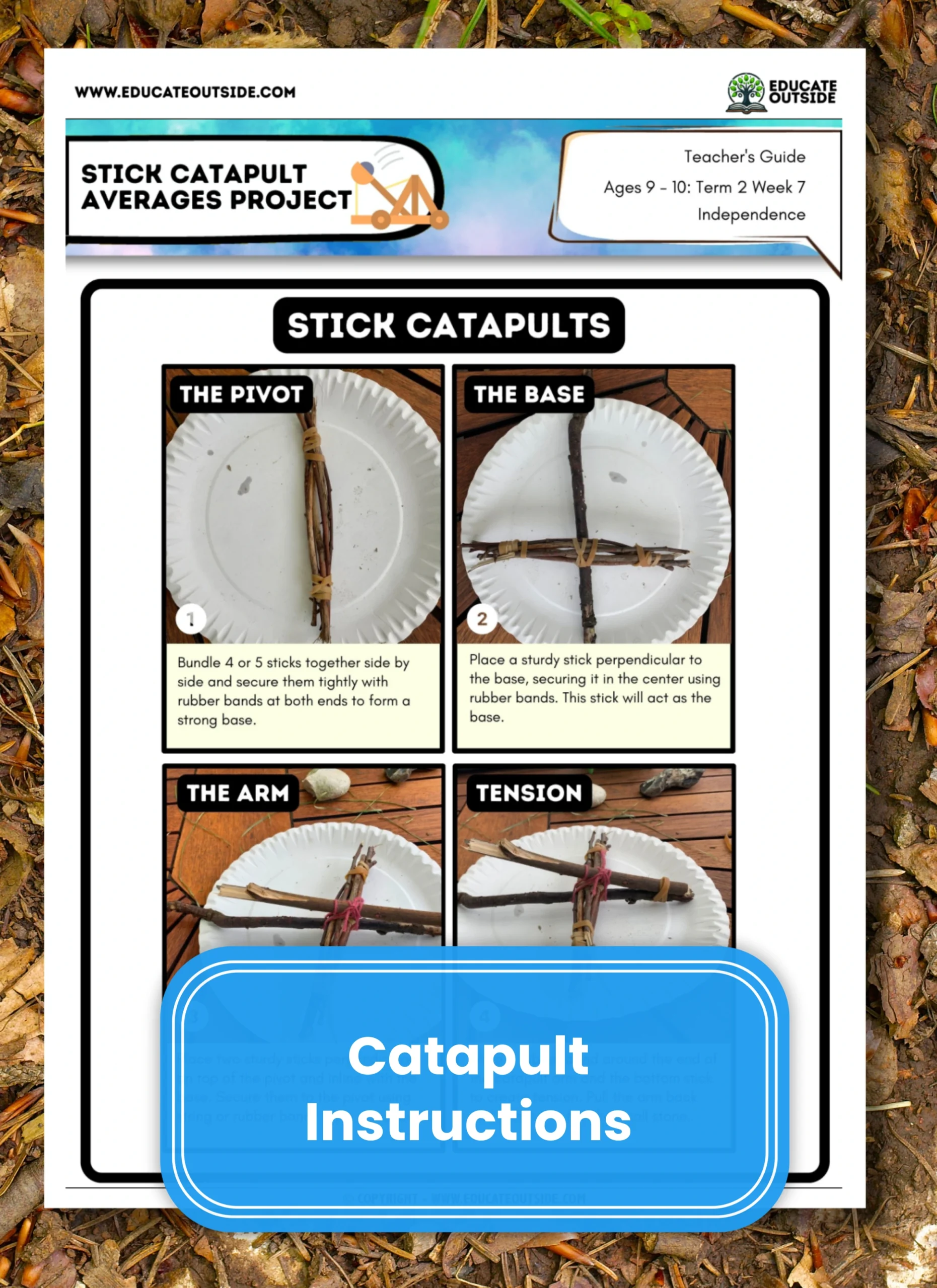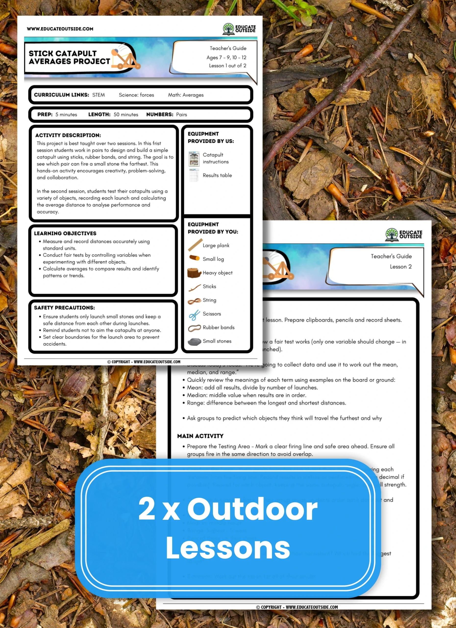 This averages math project is best taught over two sessions. In this first session students work in pairs to design and build a simple catapult using sticks, rubber bands, and string. The goal is to see which pair can fire a small stone the farthest. This hands-on activity encourages creativity, problem-solving, and collaboration.