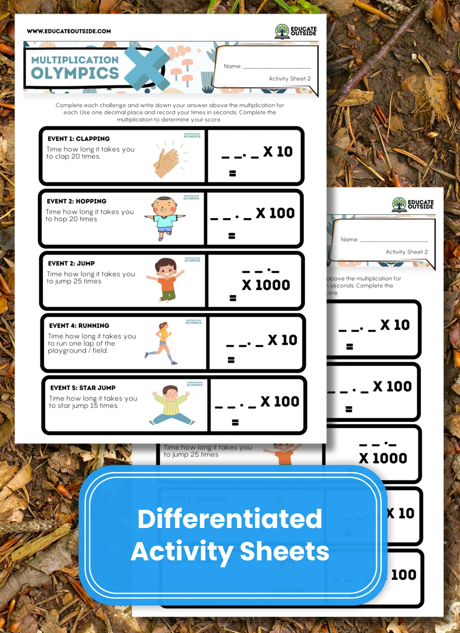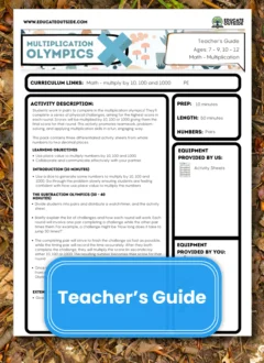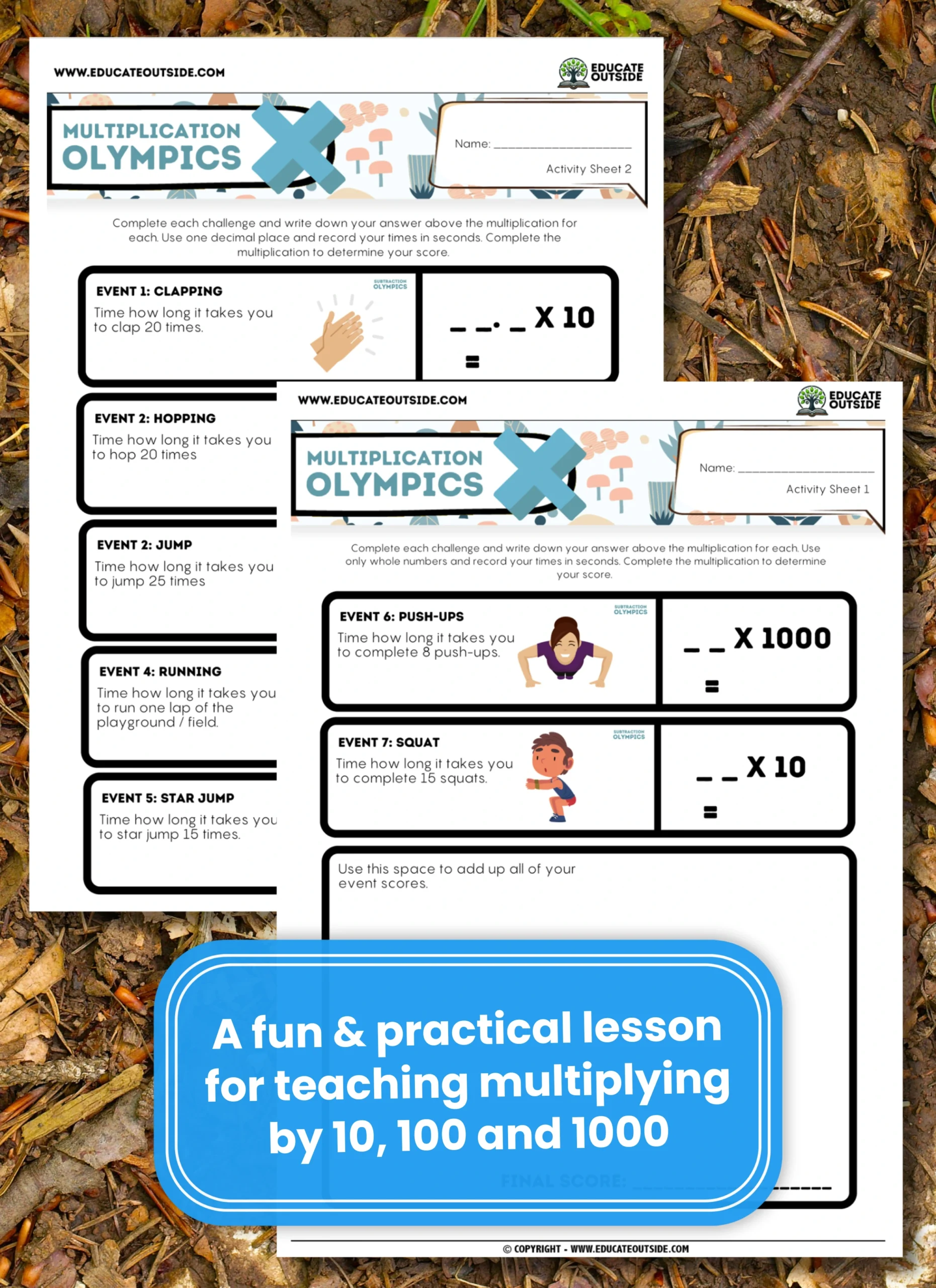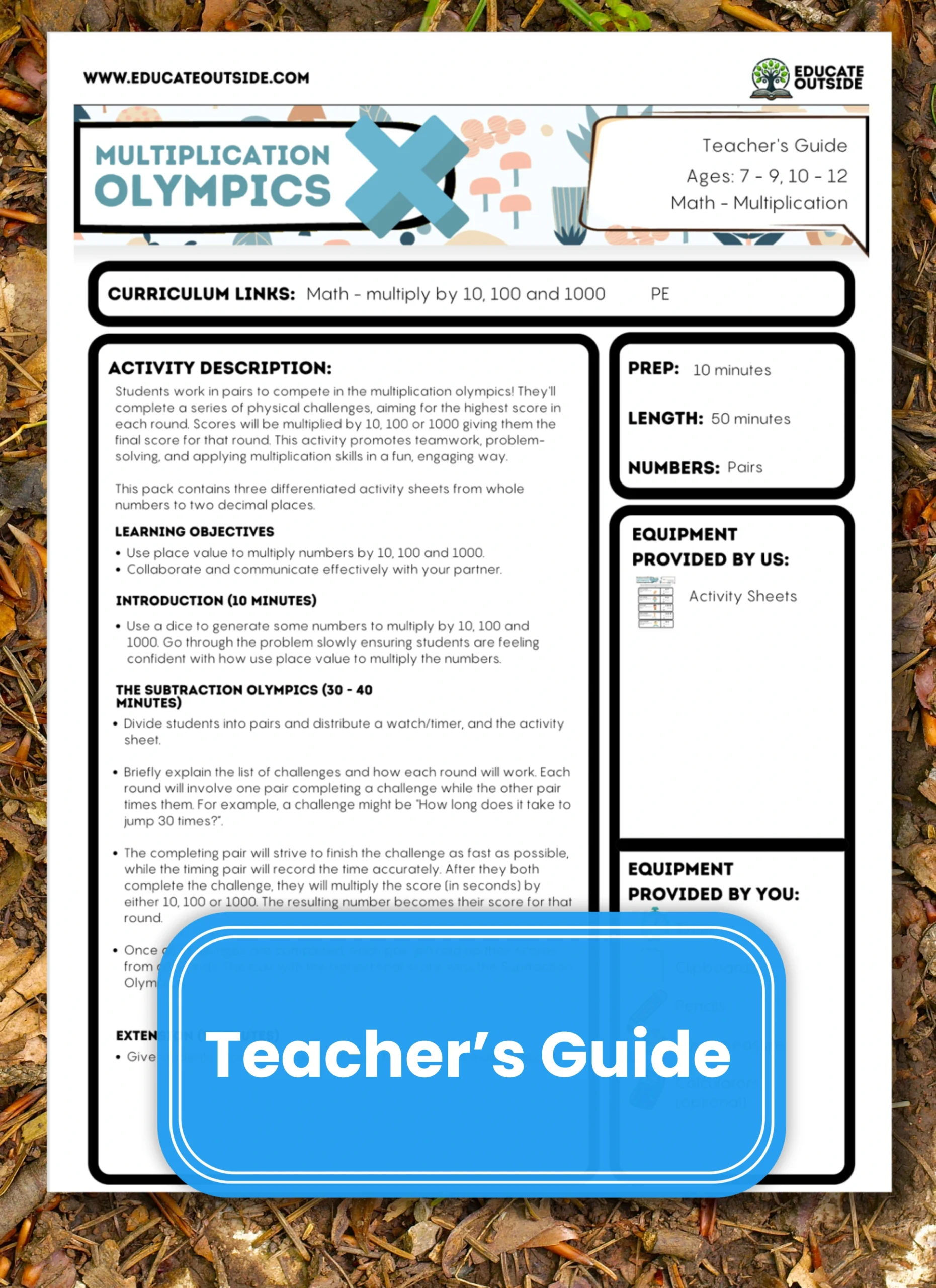 Get ready for the Multiplication Olympics! In pairs, students take on a series of exciting outdoor challenges, aiming for the highest score in each round. Each result is then multiplied by 10, 100, or 1000 to find their final score — combining movement, teamwork, and math mastery in one fun-filled activity.