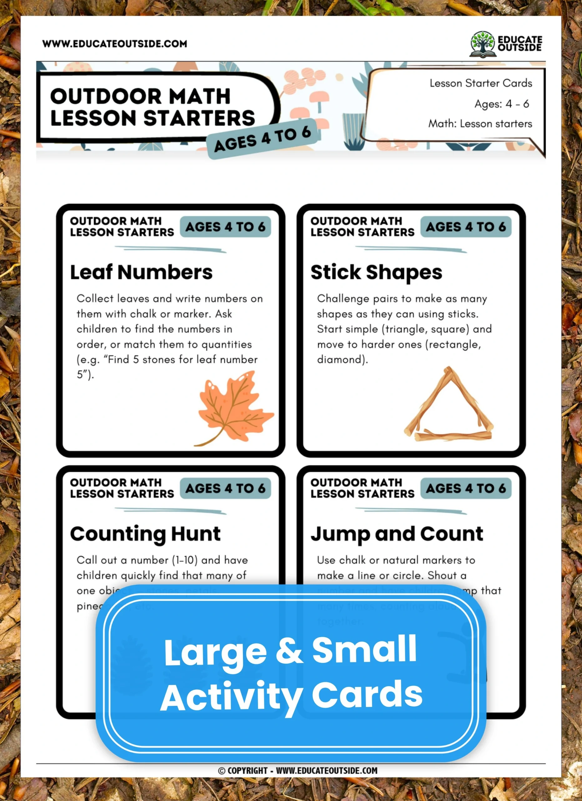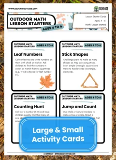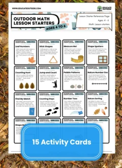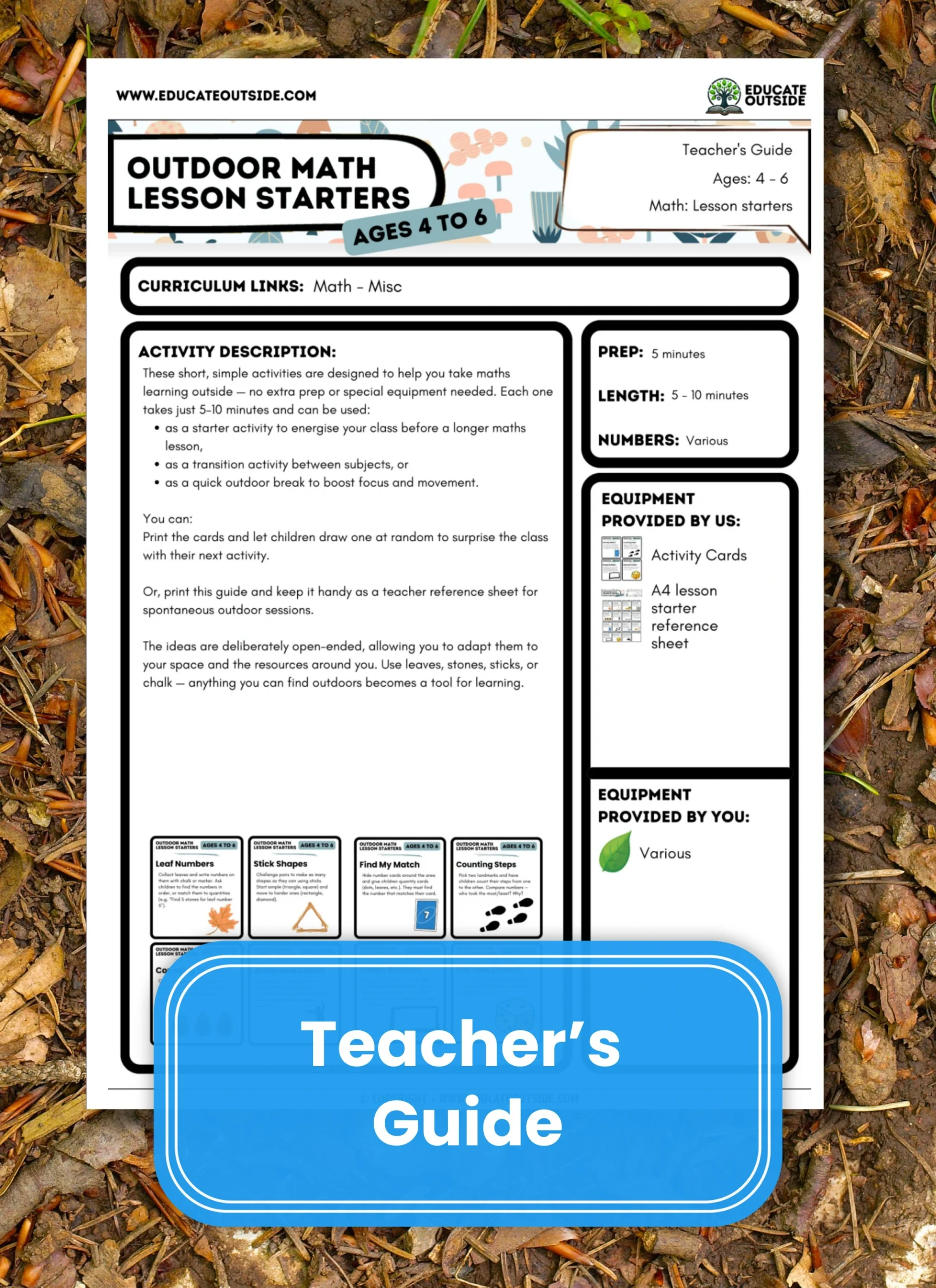 Children head outside and use leaves, sticks, stones, and chalk to practise counting, shape recognition, number matching, and early measurement — no equipment to source, no classroom required.