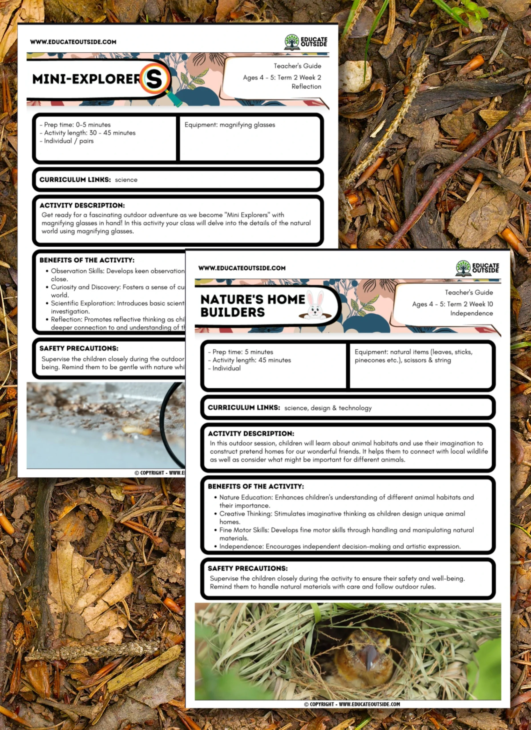 Outdoor learning bonus lessons and resources for ages 4–5 (Reception / Pre-K), designed to complement Term 1–3 of our scheme of work. These eight 45–60 minute sessions are flexible to use at any point in the year, either in school or as part of a homeschool curriculum. The lessons are simple to deliver, adaptable to most early years settings, and support reflection, teamwork, independence, and creativity while extending the outdoor curriculum.