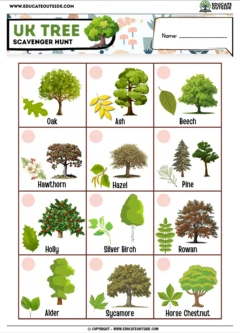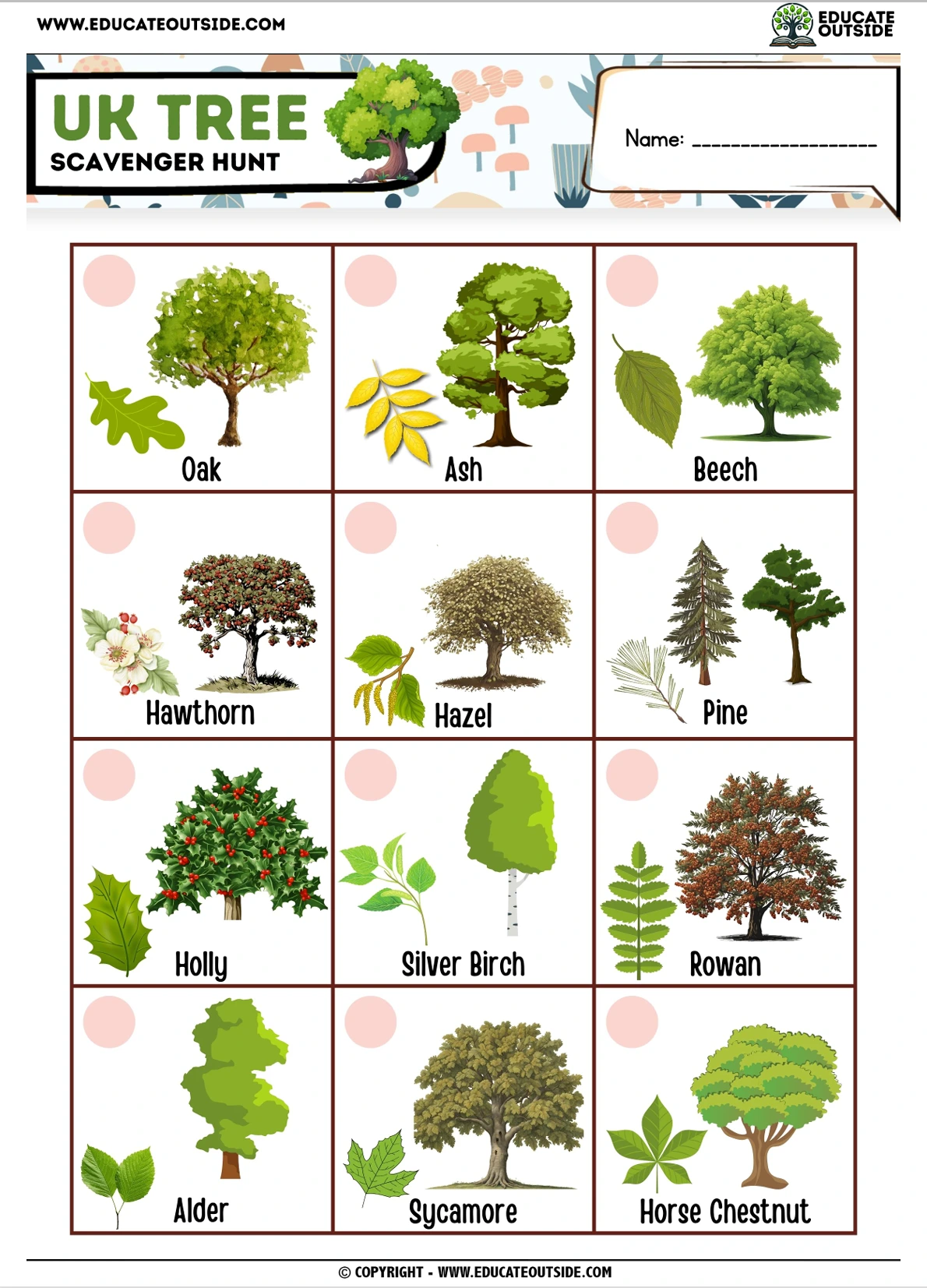 This UK Tree Scavenger Hunt features 12 common trees found across the UK, children can tick off each one as they find it. Perfect for nature walks, school trips, or garden adventures. Simply print and go!